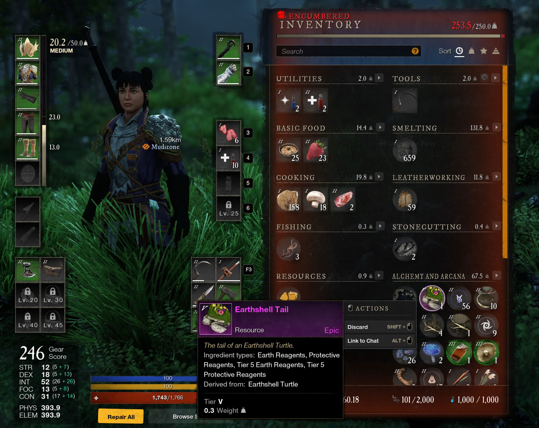I’m also having mechanical issues. I am not (normally) a keystroke/hotkey combat player. I run through rotations in WoW largely by clicking, only reaching for a hotkey when I’m panicky and desperate. New World forces you into a keystroke playstyle by locking your mouse to a center reticule that’s used to target things by hover. (I’m told this stems from the mythical FPS games.) You have the option of switching between two weapons during combat, and executing one of three abilities on a given weapon during a fight. The two weapons are default-bound to nums 1 and 2, and the three abilities are bound to Q, R, and F, respectively. I fumble this a bit.